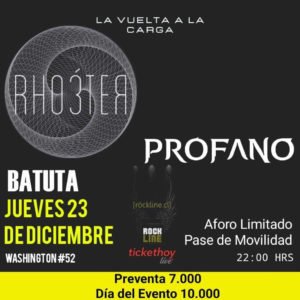 La banda Profano acaba de anunciar su última presentación de este año, junto a Rho3ter, la que tendrá lugar en el mítico escenario de La Batuta, ubicada en Jorge Washington 52, Ñuñoa, el próximo jueves 23 de diciembre desde las 22 hrs.