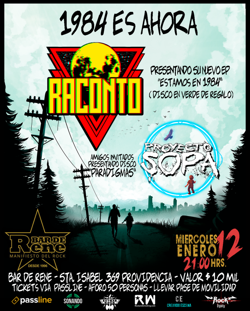 El evento será en Bar de René el miércoles 12 de enero (Santa Isabel 369, Providencia) desde las 21:00 hrs, con pase de movilidad. La entrada tiene un valor de $10.000, la que incluye el CD del EP “Estamos en 1984” de Raconto. Esta se puede adquirir online solo por passline (no hay venta en puerta).