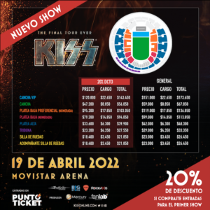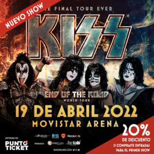 Gran expectativa existe por el show de despedida que Kiss realizará en Chile en el marco de su gira “End of the Road”. Con una primera fecha absolutamente sold out, el 20 de abril, y un gran interés del público por ver por última vez a la reconocida agrupación norteamericana, los legendarios músicos decidieron agendar un nuevo concierto, el próximo 19 de abril, en el Movistar Arena. Además, los fanáticos que quieran repetir la experiencia, y cuenten con tickets para el 20 de abril, podrán adquirir con un 20% de descuento sus entradas para el nuevo concierto. Venta de entradas en PuntoTicket.