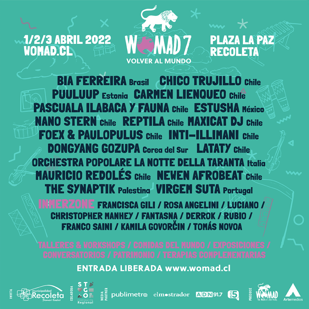 • Además, entre las últimas novedades, llegará INMERZONE, el primer escenario completamente inmersivo en nuestro país, con un line-up que incluye instalaciones y paisajes sonoros, live set con Rubio y Derrok, entre otros, y DJ set de artistas  chilenos como Franco Saini y Kamila Govorčin, para alargar las noches de celebración en Womad, el Festival del Mundo.