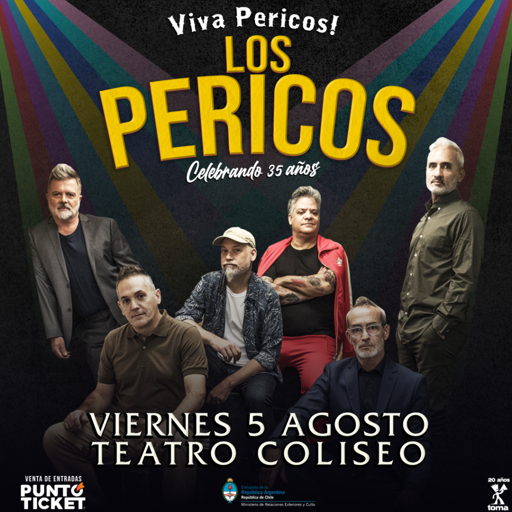El festejo de la banda argentina tendrá lugar en el Teatro Coliseo, el próximo viernes 5 de agosto. Ahí, a metros del palacio de La Moneda, en pleno corazón de la capital del país, viviremos una jornada memorable, con los éxitos que han marcado a varias generaciones, y además con el esperado estreno en Chile de lo que será su nuevo disco de versiones de clásicos de todos los tiempos la música popular latinoamericana, titulado “Viva Pericos”, del que ya estrenaron el hit de Roberto Carlos “La distancia” y “El próximo viernes”, del mexicano Espinoza Paz.