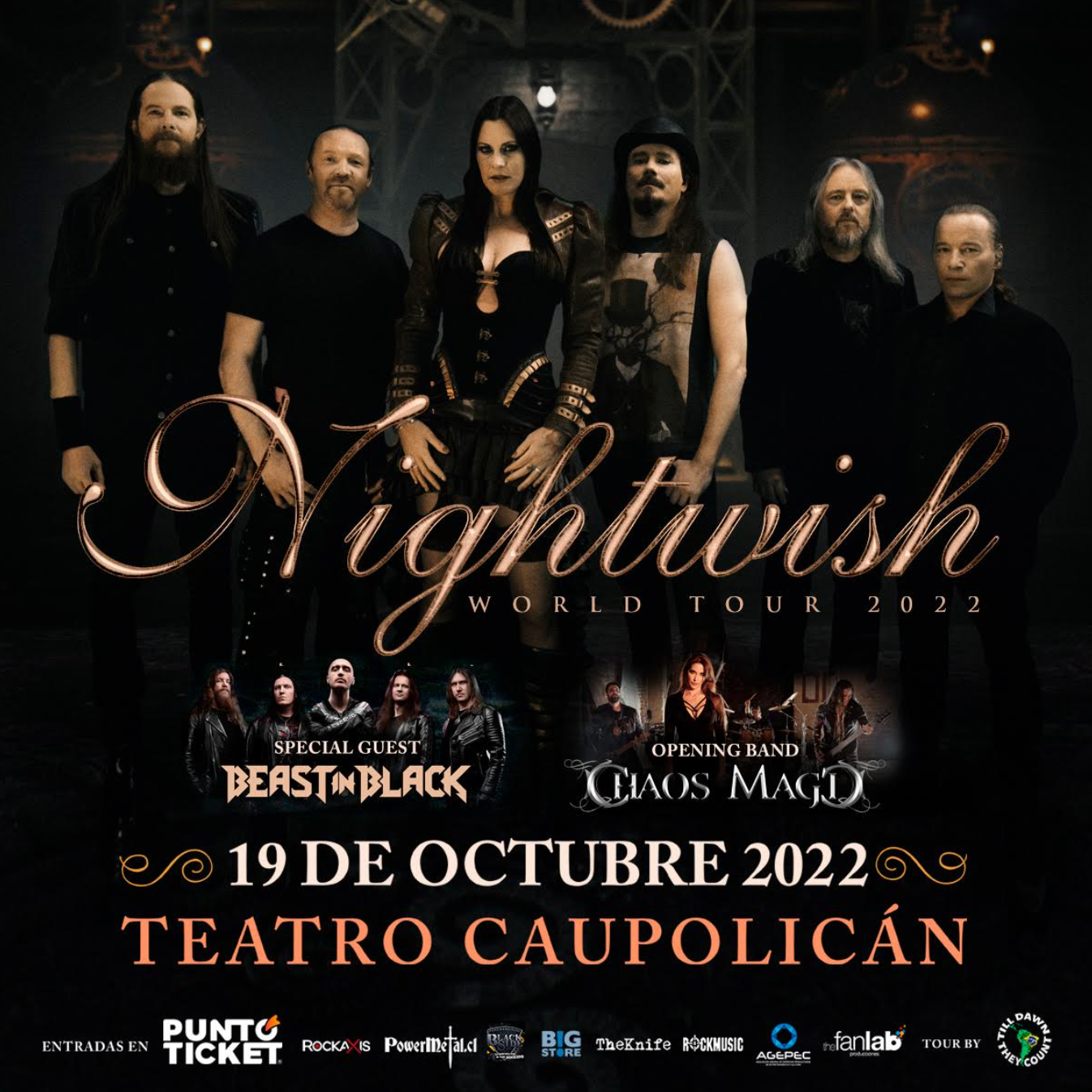 Gran expectación existe por el concierto de Nightwish en nuestro país, el miércoles 19 de octubre en el Teatro Caupolicán. La banda finlandesa volverá a Chile para presentar su más reciente disco “Human.:II:Nature.” y los clásicos que han marcado su connotada trayectoria. En esta oportunidad, al virtuosismo y energía de Nightwish, una de las agrupaciones más relevantes de este género, se suman los también finlandeses Beast in Black, en su primera visita a Sudamérica y los nacionales Chaos Magic. Entradas disponibles en PuntoTicket.