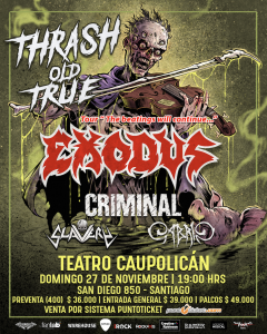 Exodus, la banda más importante, y reconocida como precursora del thrash metal, precursores del Bay Area anuncia su concierto en Chile, el próximo domingo 27 de noviembre, en el Teatro Caupolicán, acompañada de Criminal, Slavery y Cabrío, como bandas invitadas. En la ocasión, los fanáticos de Exodus, podrán disfrutar de un recorrido por toda su extensa trayectoria, además de la presentación de su último disco “Persona non Grata” de 2021. Entradas disponibles enPuntoTicket, desde hoy miércoles 13 de julio a las 12:00 hrs.