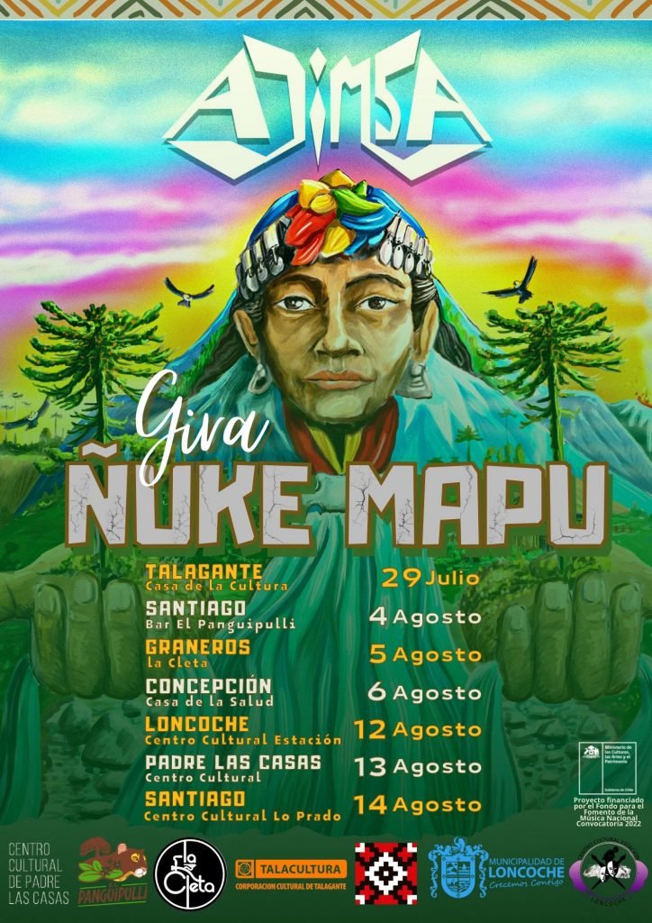 La banda franco-chilena Ajimsa acaba de lanzar el sencillo Ñuke Mapu (“Madre Tierra” en mapuzungun), el que ya se encuentra disponible en plataformas digitales y que formará parte de su cuarto disco de estudio. Además, anunció 7 presentaciones en vivo en 4 regiones en las que compartiran escenario con muchas bandas locales con el  fin de crear una vinculación con la escena local.