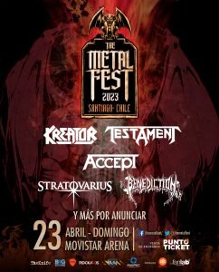 La noticia de la realización de una nueva edición de The Metal Fest ha causado gran revuelo a nivel nacional. El encuentro que se realizará el 23 de abril de 2023, en el Movistar Arena, ya tiene confirmadas a las bandas extranjeras Kreator, Testament, Stratovarius y Benediction, line up que es sólo el comienzo de grandes sorpresas. En esta línea, es que es el turno de anunciar a los poderosos Accept, que llegarán a Chile a mostrar todo su histórico heavy metal. Entradas disponibles en PuntoTicket.