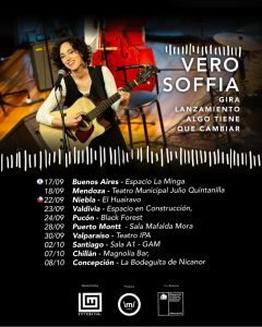 El próximo sábado 17 de septiembre comienza la gira de lanzamiento del nuevo disco de Vero SoffiaAlgo Tiene que Cambiar con un concierto en Espacio La Minga, en Buenos Aires. El domingo 18 se trasladará al Teatro Municipal Julio Quintanilla en Mendoza, para continuar por otros 8 escenarios de 7 regiones de Chile.