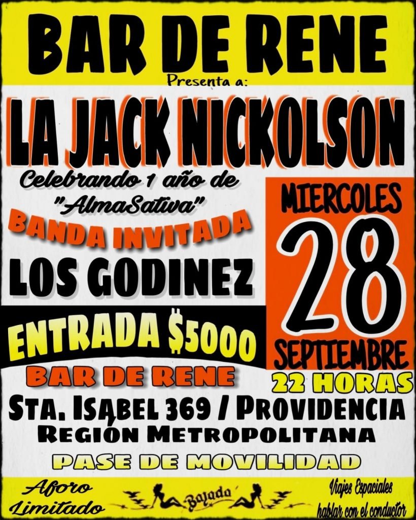 La banda nacional La Jack Nickolson está preparando la celebración del primer aniversario de su disco “Almasativa”. La cita será el día miércoles 28 de septiembre a las 22:00 hrs en Bar De René, legendario lugar dentro de la escena musical chilena.