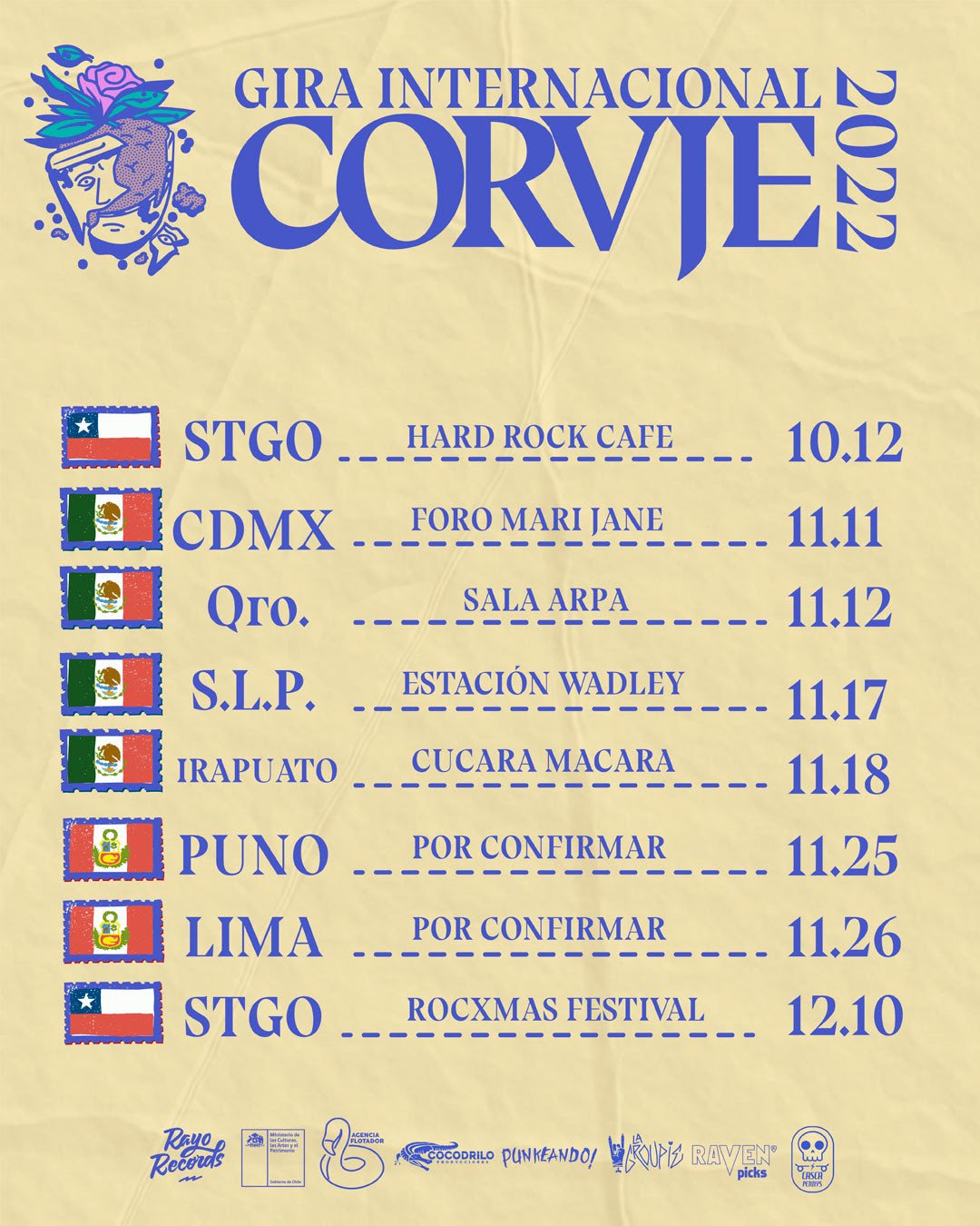 Con ese entusiasmo, los integrantes de Corvje concretarán su tercera visita a Perú y México, aunque por primera vez lo harán durante una sola gira. De esta forma, se presentarán en Ciudad de México (11 de noviembre), Querétaro (12 de noviembre), San Luis de Potosí (17 de noviembre), Irapuato (18 de noviembre), Puno (25 de noviembre) y Lima (26 de noviembre). Para cerrar la travesía con un show en Santiago el 10 de diciembre.