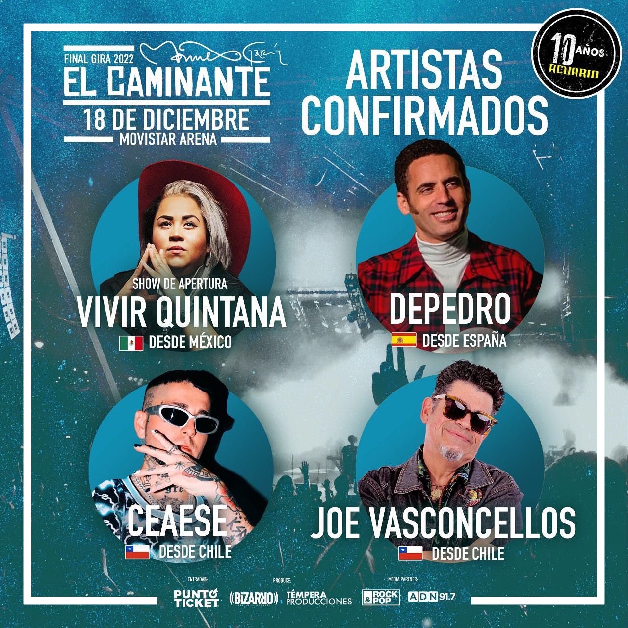 El show contará con músicos invitados y servirá para festejar los diez años de su disco “Acuario”. La experiencia promete ser única con una novedosa puesta en escena. Por nuestro país estarán Joe Vasconcellos y CEAESE, ambos artistas muy reconocidos en la escena nacional. Mientras que desde México viene al Movistar, Vivir Quintana y desde España, Depedro.