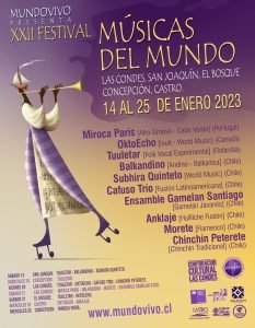 Finalmente, el Festival Músicas del Mundo tendrá su cierre 2023 el miércoles 25 de enero en la ciudad de Castro con el show de Oktoecho y Anklaje, y en paralelo en Concepción con el concierto de Miroca Paris.