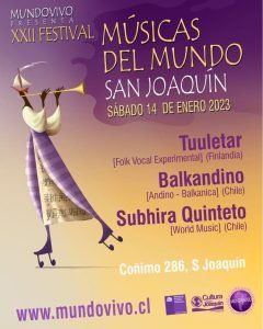 Subhira quinteto: Una de las principales figuras de la World Music chilena, con más de 20 discos publicados y decenas de giras internacionales, especialmente en Europa donde cuenta con un gran número de seguidores y se ha presentado en los principales festivales del estilo. Su música mezcla material sonoro de diversas culturas del mundo con especial énfasis en las de pueblos originarios del sur de América.