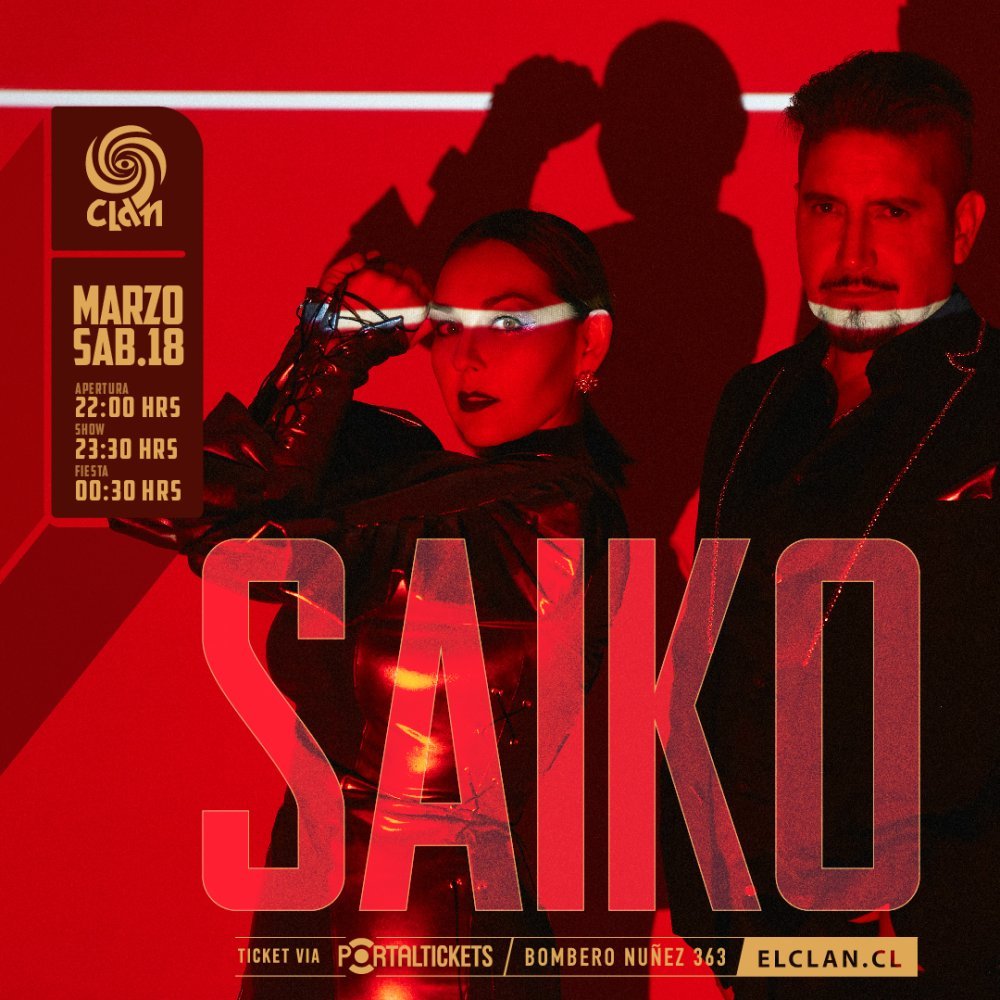El día sábado 18 de marzo se cierra la semana con Saiko. Hablar de esta banda es referirse a más 20 años de carrera musical, donde dos de sus integrantes hasta del día hoy sostienen musicalmente el proyecto, Luciano Rojas y Denisse Malebrán.