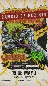 Santiago, 10 de mayo de 2023. Debido a la baja venta de entradas, la producción de este evento anuncia el traslado del concierto de Whiplash y las bandas Perpetual Warfare, Massive Power y Disaster al Bar Óxido. Las entradas ya emitidas siguen siendo válidas. Quienes deseen el reembolso de su dinero deben solicitarlo en http://www.passline.com/devoluciones hasta el día del evento.