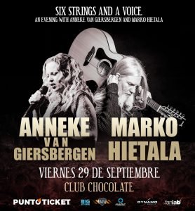 La ex The Gathering y el ex Nightwish, llegarán al país para ofrecer su espectáculo acústico “Six strings and a voice: an evening with Anneke van Giersbergen and Marko Hietala”. En esta ocasión, los trascendentales exponentes del metal se presentarán por primera vez juntos en Chile, en un show único que realizarán el próximo 29 de septiembre, a las 20:30 horas, en Club Chocolate. Entradas en PuntoTicket.