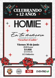 La presentación en vivo de la última producción de En Tu Memoria, en conjunto con la celebración de los 12 años de trayectoria de HOMIE, se llevará a cabo el próximo 30 de Junio a las 20:00 hrs en la Sala SCD Bellavista. Durante la velada, ambas bandas ofrecerán un espectáculo único, donde En tu Memoria presentará su nuevo EP en su totalidad y realizará un recorrido por su anterior producción, “Caminos distintos“.