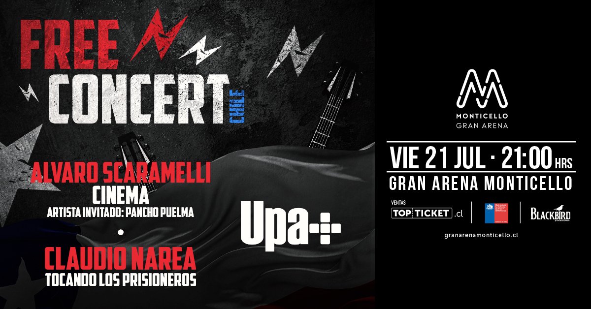 Tres íconos de la música chilena ochentera pisarán el escenario de Gran Arena Monticello: Upa+, Claudio Narea y Álvaro Scaramelli. Estos tres íconos de la música nacional aterrizarán en San Francisco de Mostazal el próximo 21 de julio y las ya están disponibles por el sistema Topticket.