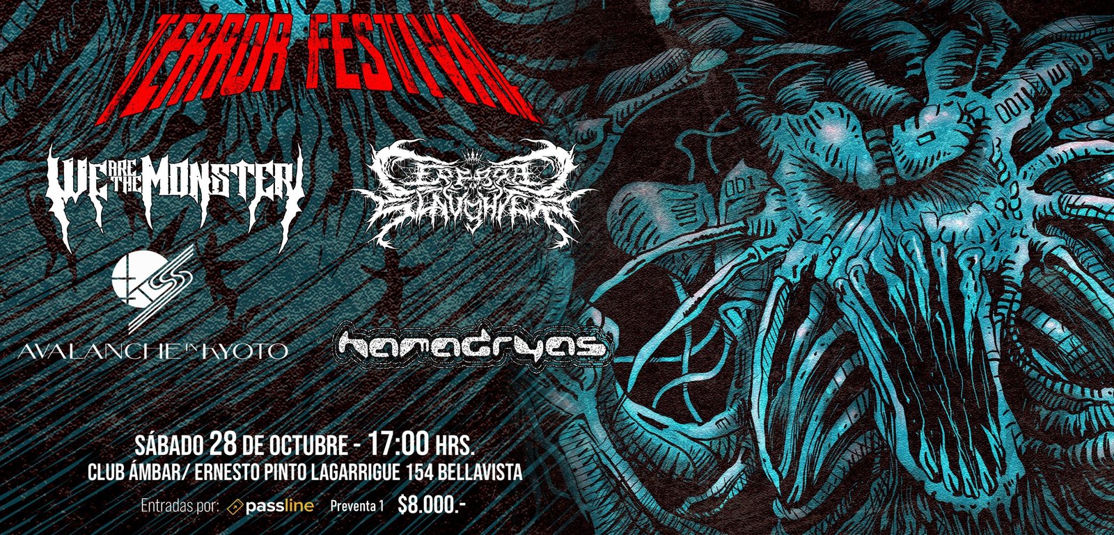 El sábado 28 de octubre, Terror Fest reunirá a las bandas más influyentes y talentosas del género, provenientes de Santiago y Talca, en Club Ambar desde las 17:00 horas. Esta experiencia programada de música está ajustada precisamente para tener en el escenario a bandas como We Are The Monster, Avalanche in Kyoto, Cerebral Slaughter y Hamadryas; selectivo line up como para ir preparando los oídos.