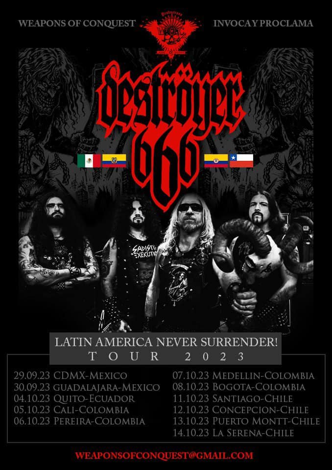 La banda australiana de Black-Thrash Metal formada en 1994 se presentará por primera vez en Concepción el jueves 12 de octubre en Casa de Salud Brasil # 574, todo esto en el marco de su gira Latín América Never Surrender! Tour 2023, y celebrando 29 años de carrera como banda. “Deströyer 666” desatara en vivo todo el anti-cristianismo, satanismo, guerras y nihilismo que incluyen en su más reciente y último álbum de estudio sacado el 2 de diciembre de 2022 titulado “Never Surrender” que fue producido por el sello francés Season Of Mist.”.