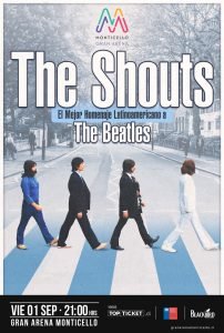 El próximo viernes 1 de septiembre llegará a Gran Arena Monticello The Shouts, agrupación argentina que recrea a la perfección a la mítica banda inglesa The Beatles y que fue consagrada como “Mejor Banda Beatle de Latinoamérica” luego de ganar el certamen “Semana Beatle de Latinoamérica” llevado a cabo en Buenos Aires en el año 2005. Las entradas están a la venta por el sistema Topticket.cl
