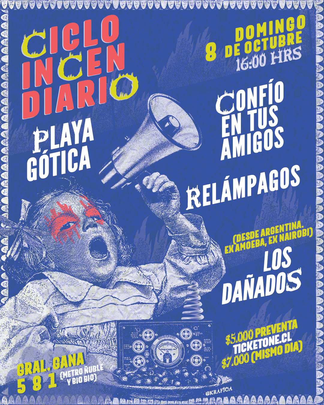 Comienza el mes y los shows no se hacen esperar, partimos este fin de semana con Ciclo Incendiario. Instancia nacida en Buenos Aires el año 2010 como organización de recitales/conciertos para artistas independientes y autogestionados para dar mayor visibilidad a la creatividad y el arte, el cual aterrizó en Chile por allá por el 2015.