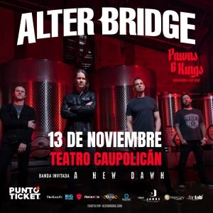 A días del esperado debut de la agrupación norteamericana Alter Bridge en nuestro país, la organización del evento anuncia que la banda invitada será A New Dawn, banda chilena que resurgió luego del fin de Temple Agents. La cita con estos dos grandes exponentes del hard rock será el próximo 13 de noviembre, a las 20:30 horas, en el Teatro Caupolicán. Últimas entradas disponibles en PuntoTicket.