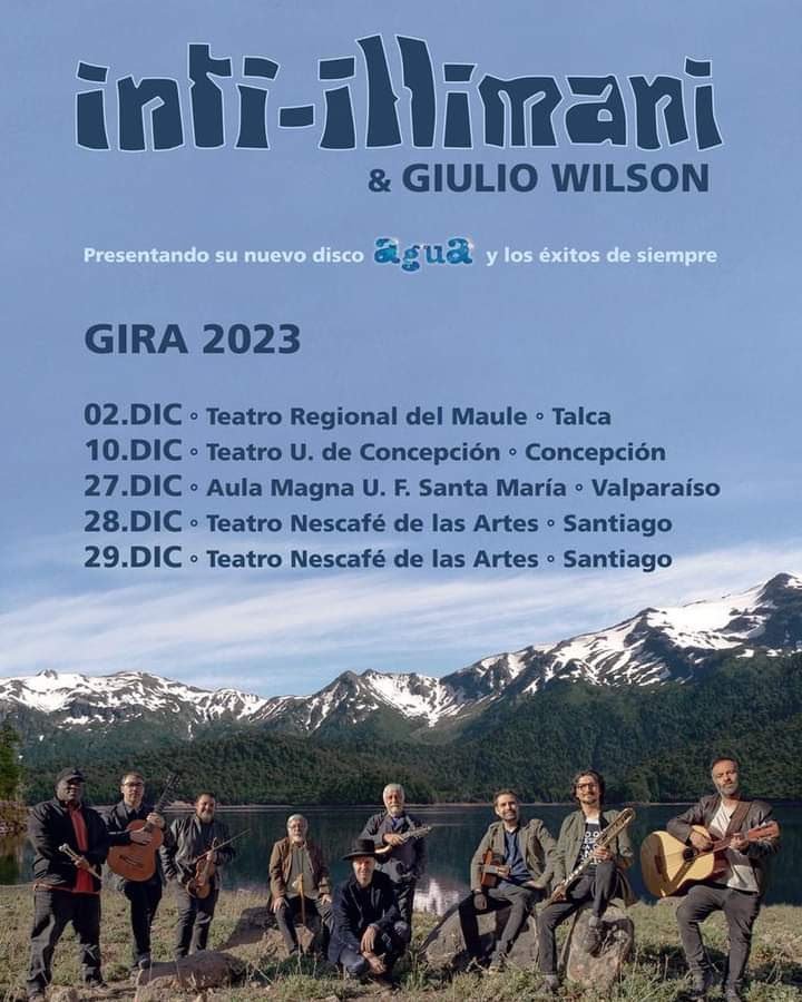 En medio de un exitoso año, en el que Inti-Illimani ha realizado exitosas giras en Europa y Sudamérica, la trascendental agrupación vuelve a Chile para ofrecer su nuevo espectáculo con fechas confirmadas en Santiago y regiones. La primera parada de su Agua World Tour 2023 será el 2 de diciembre en Talca, para luego continuar el 10 de diciembre en Concepción, el 27 de diciembre en Valparaíso y el 28 y 29 de diciembre en Santiago.