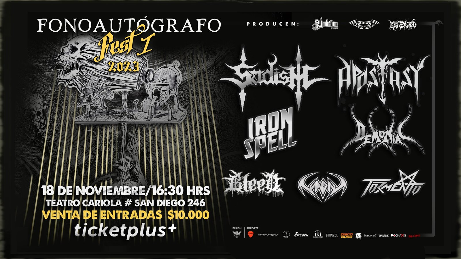 Apostasy, legendarios estelares de un brutal black thrash metal directo desde el puerto de Valparaíso celebrando 35 años de carrera. Demoniac, presentando su reciente obra “Nube Negra” en una revolucionara presentación. Iron Spell, y su eterno pacto con el hierro, perfecto para todos los amantes del más puro y verdadero heavy metal. Tormento, y su oscuro heavy metal conquistando y arrasando con su brutal agresión. Vandal, desde Melipilla presentando su álbum “Obertura“. Y se suman también como invitados especiales desde Rancagua, Bleed, presentando su última producción “Magna Morte“.