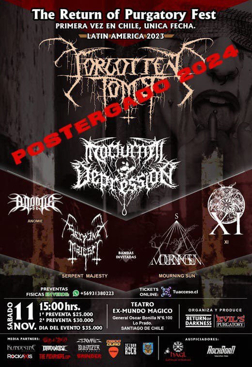 Este fue el comunicado emitido por Noise Factory: “¡Buenos días Purgadas Hordas! Lamentamos profundamente como productora regional dar a conocer la postergación de la gira latinoamericana de Forgotten Tomb y Nocturnal Depression en Sudamérica, pero por motivos que escapan a nuestro control no será viable la fecha para este 2023. ¡A veces se presentan situaciones que escapan de nuestro control, pero en este caso fueron explicadas por el Booking internacional “Noise Factory” y de parte de ellos y las bandas en cuestión se nos comunicó que la gira se haría el próximo 2024, así que atentos a las nuevas fechas de la gira latinoamericana!