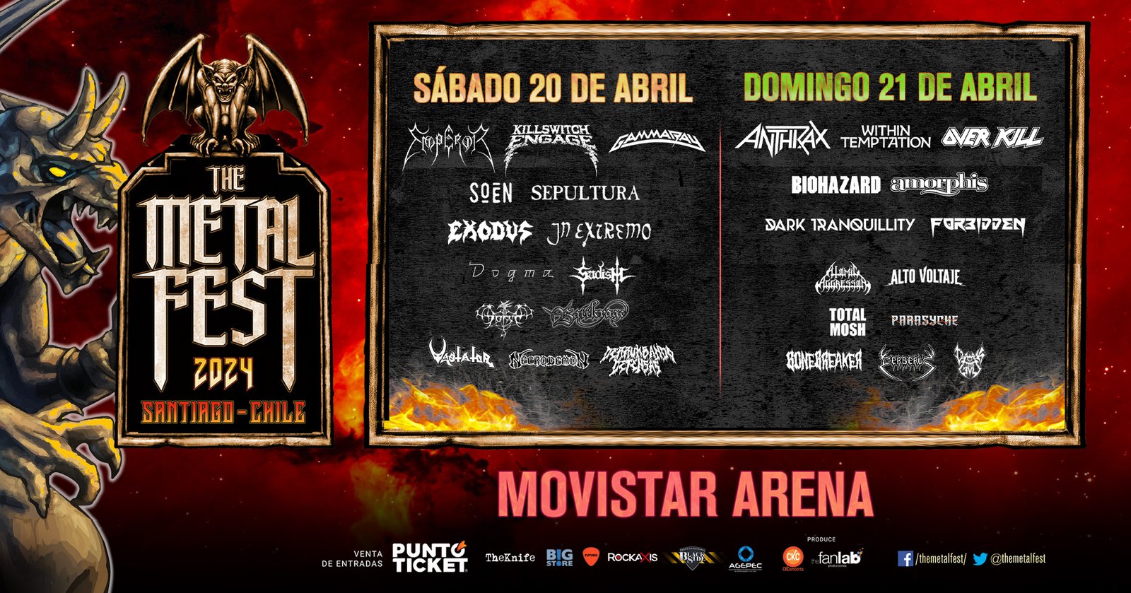 El sábado 20 de abril, The Metal Fest contará con las presentaciones de Emperor, Sepultura, Soen, Killswitch Engage, In Extremo y EXODUS, en el plano internacional, junto a las nacionales Dogma, Sadism, Dorso, Battlerage, Vastator, Necrodemon y Derrumbando Defensas.
