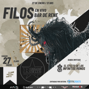 Este año Filos no se detiene, y comienza presentándose por primera vez en el reconocido Bar de René el próximo 27 de Enero, junto a la banda de rock nacional “El Efecto de los Infinitos Monos”, formada en el año 2022, se han destacado en la escena musical por la energía fresca y potente que entregan en casa uno de sus shows. Desde su debut, han lanzado tres sencillos con una identidad sonora, y un espíritu crítico que llama a la reflexión activa. Este 2024 tienen planes de grabar su primer álbum y su último sencillo “Sin Perdón” ya se encuentra disponible en todas las plataformas digitales.