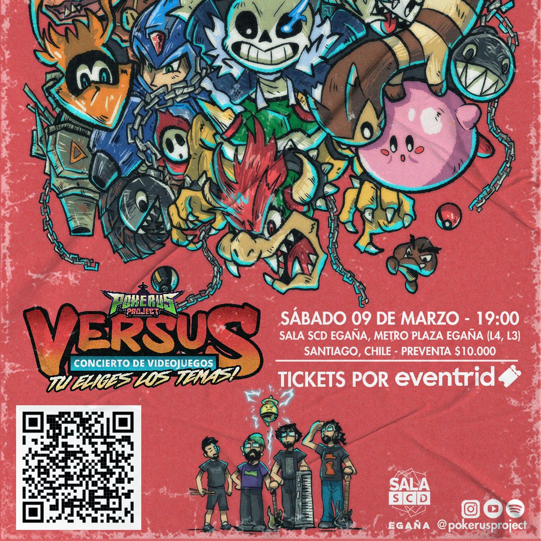 Pokerus Project, una de las bandas más longevas de música Rock de Videojuegos trae a Santiago una experiencia increíble y dinámica que te va a encantar si eres fanático de la cultura de los videojuegos y su música: “Concierto Gamer Versus”, un evento potentísimo de música nerd que se presentará en la Sala SCD del Mall Plaza Egaña, en Santiago. Un recital donde se interpretarán en vivo por una banda de rock temas clásicos de juegos como Super Mario Bros, Pokémon, The Legend Of Zelda, Undertale y muchos más. Lo diferente de este concierto es que el mismo público es el que elige los temas a interpretar en el minuto, enfrentando canciones, personajes y franquicias en una modalidad “Versus”.