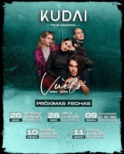 Kudai llega a celebrar esas dos décadas desde su álbum debut “Vuelo”, y están invitadisimos a conmemorar su adolescencia en la región del Biobío en Talcahuano y finalizando en la región de la Araucanía con Temuco y Pucón.