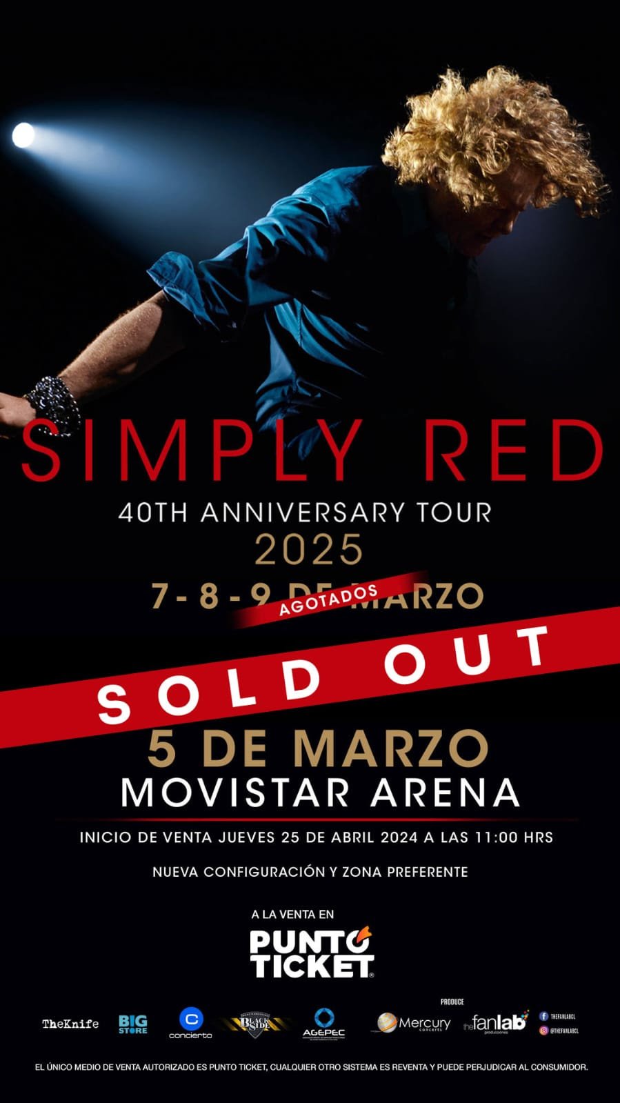 Simply Red con el carismático Mick Hucknall a la cabeza, agotó los tickets para el cuarto espectáculo que dará en Santiago, en el marco de la gira mundial ‘40th Anniversary Tour’. A las fechas ya anunciadas del 7, 8 y 9 de marzo de 2025, que ya son sold out, la banda volvió a repetir el inédito éxito, vendiendo en su totalidad los tickets para el nuevo concierto que está agendado para el 5 de marzo en el Movistar Arena.