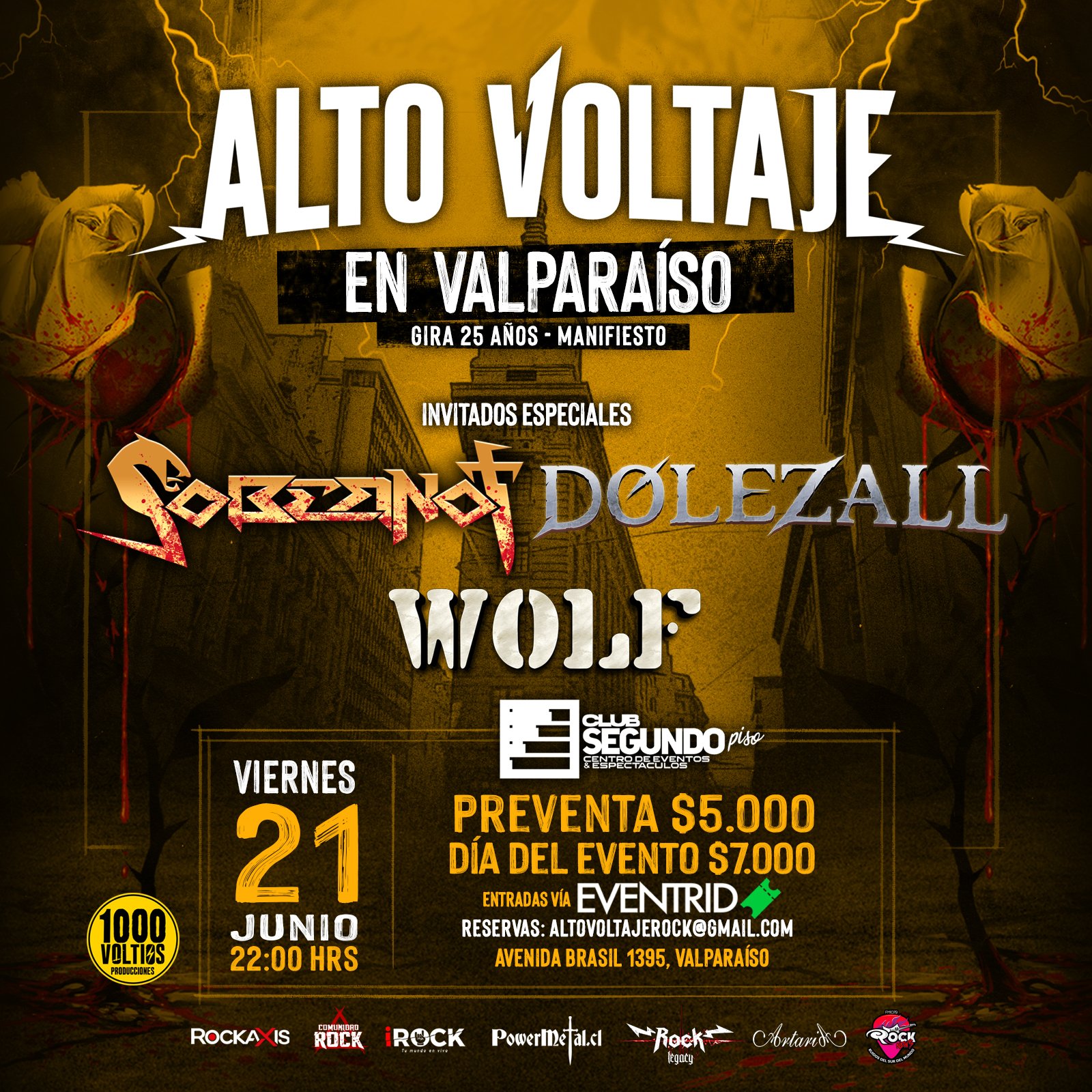 Club Segundo Piso abre sus puertas para recibir a la banda Santiaguina Alto Voltaje que están girando con su nuevo disco Manifiesto y celebrando sus 25 años de música. El show contará con invitados especiales : Sobernot – Dolezall y Wolf . Ademas si quieres ser parte de esta fiesta del rock y metal chileno, puedes viajar con las bandas en el bus que saldra el dia viernes 21 con un valor que te da el derecho a viajar ida y vuelta mas ticket de ingreso al show.