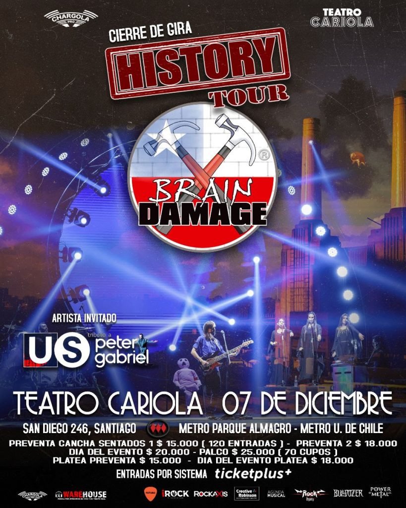 Formada en el año 2001 y siendo ampliamente reconocida no solo en Chile, sino que también en otros países de Sudamérica, Brain Damage promete deleitar con un concierto pulcro, respetuoso y cuidado en cada detalle, con una escenografía nueva que llevará a los asistentes a una experiencia 100% floydeana, dentro de un ambiente íntimo y familiar en el que podrán asistir fanáticos de todas las edades para disfrutar de la magia de este imperdible “History Tour”, el próximo 7 de diciembre en el icónico Teatro Cariola.