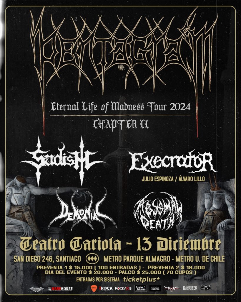 Reconocida como una de las agrupaciones nacionales más emblemáticas de death/thrash, Pentagram llegará tras culminar una gira por Europa para repasar lo mejor de sus casi cuatro décadas de trayectoria, destacando la presentación de su último disco “Eternal Life of Madness” recién lanzado el pasado abril de este año y que cerrará su tour en esta especial ocasión junto a cuatro bandas que prepararán el ambiente con lo más destacado del metal local. Cabe destacar que Pentagram también pasará por Brasil, previo a su presentación en Santiago de Chile.