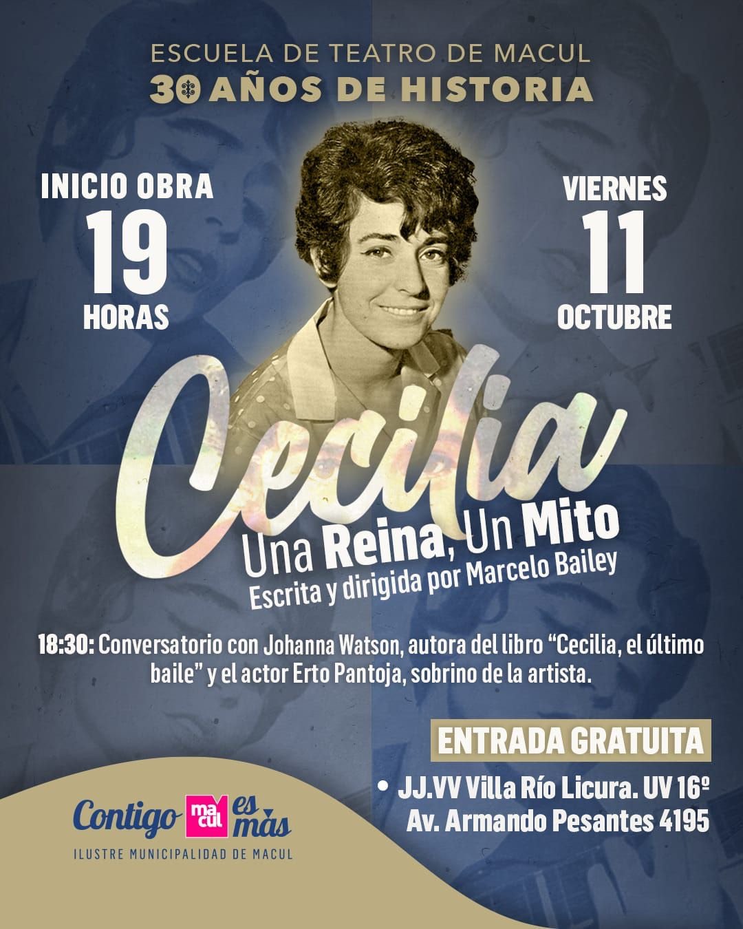 La obra de teatro “Cecilia. Una reina, un mito” escrita y dirigida  por Marcelo Bailey en 1997. La puesta en escena volvió este año a las tablas, a través de un trabajo coordinando entre el director, su escuela y el municipio de Macul, y tendrá este viernes 11 de octubre, la última función de esta temporada.