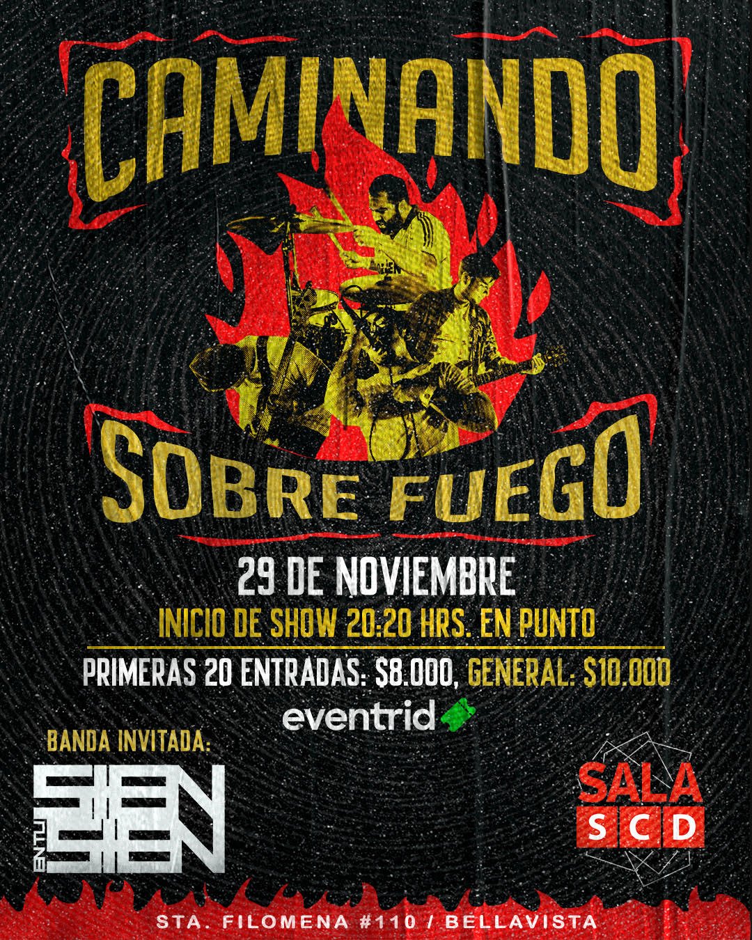 Las bandas nacionales Caminando Sobre Fuego y Sien en tu Sien se presentarán el viernes 29 de noviembre a las 20:00 horas en la emblemática Sala SCD de Bellavista (Santa Filomena 110, Recoleta) Caminando Sobre Fuego, conocidos por su estilo contundente y cargado de energía, prometen un show renovado, con una nueva propuesta musical y algunas canciones inéditas que marcarán un antes y un después en su carrera. Los fans podrán disfrutar de un setlist fresco y experimental que muestra la evolución de la banda.