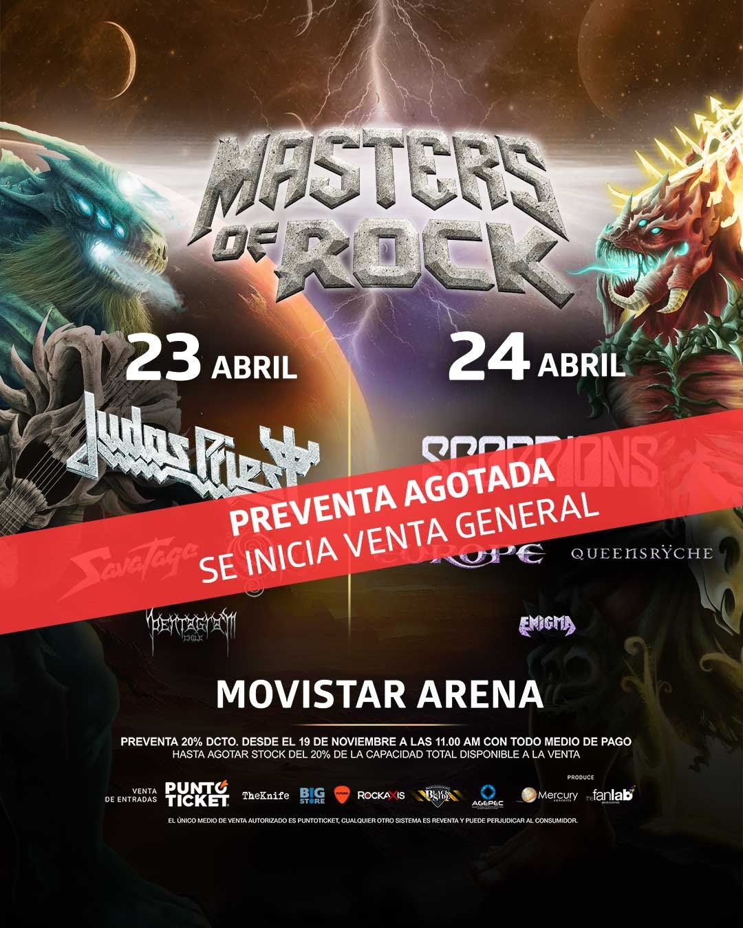 Los fanáticos del rock de todos los tiempos se llenaron de expectativas con el anuncio de Masters of Rock Chile, icónico encuentro que agotó sus entradas en preventa en menos de una hora. Por primera vez, este imperdible evento musical se desarrollará en dos jornadas, los días 23 y 24 de abril de 2025 en el Movistar Arena, con los más importantes exponentes del rock a nivel mundial. Venta general, disponible desde ahora, en PuntoTicket.