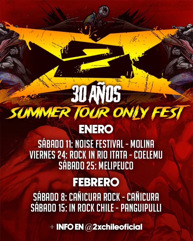 En el marco del 30 aniversario como pioneros del Nu Metal en Chile, y después de un emocionante 2024, 2X no para. Continuarán su gira con nuevas fechas para este Verano 2025: “Summer Tour Only Fest”, donde participarán de los mejores festivales al aire libre de nuestro país, enfocado en la zona sur de Chile. Mostrarán lo mejor de su repertorio, por lo que ¡prepárense para disfrutar de la energía y la pasión que a 2X caracteriza!