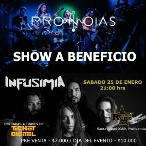 La recaudación completa, irá en beneficio de la amiga que está pasando por un difícil momento. ¡Imperdible jornada que mostrará lo solidario que es el público del metal chileno! Adquiere acá tu entrada: https://www.ticketdigital.cl/detalle/pronoias-infusimia-2025-01-25-21-00
