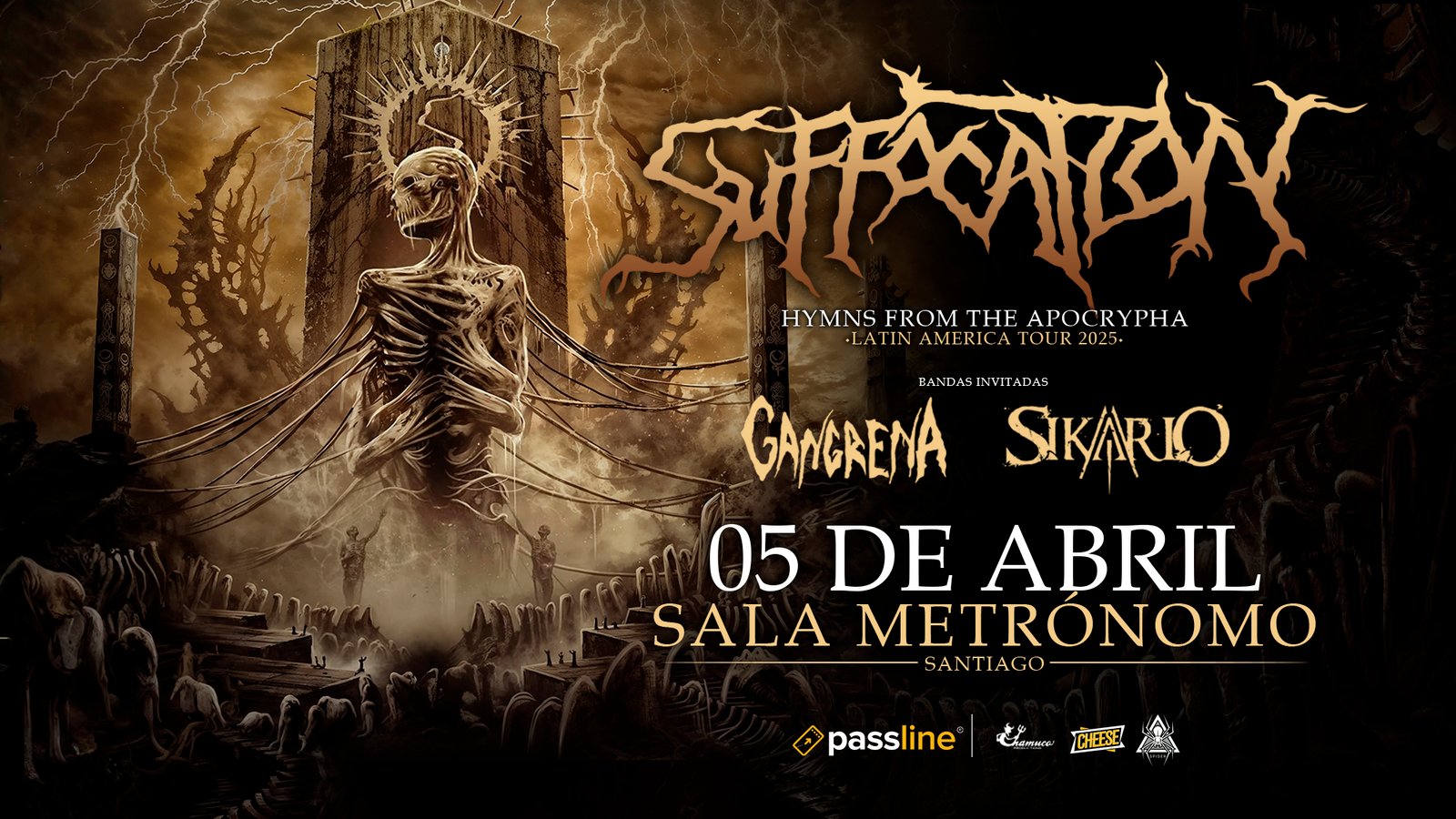 Los maestros de death metal técnico, Suffocation, saben bien que en Chile siempre tienen abiertas las puertas del averno. Su retorno ya tiene fecha para el sábado 5 de abril en Sala Metrónomo, en una jornada infernal que contará con Gangrena y Sikario como bandas chilenas invitadas para completar un cartel colmado de brutalidad y desenfreno.