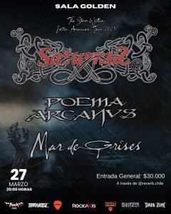 SATURNUS, POEMA ARCANVS y MAR DE GRISES, arrancarán, su gira en RANCAGUA, con fecha ya pactada para el jueves 27 de marzo a las 20:00 horas en la Sala Golden, ubicada en Avenida LibertadorBernardo O’Higgins 063. (Entradas Limitadas), a través del WSP: +56984672152 o al E- mail: andrescornejo.18@gmail.com, primeros 50 cupos $ 25.000, entrada general: $ 30.000
