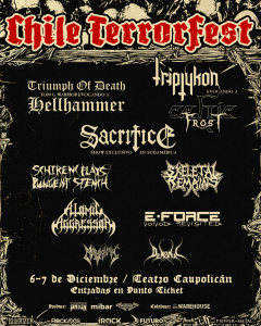 Chile Terrorfest se realizará los días 6 y 7 de diciembre en el Teatro Caupolicán de Santiago. El line-up de bandas confirmadas hasta el momento es: Triptykon evocando a Celtic Frost, Triumph Of Death evocando a Hellhammer, Sacrifice, Schirenc Plays Pungent Stench, Skeletal Remains, Atomic Aggressor, Mayhemic y Demoniac.