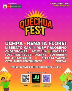 El próximo 21 de junio, la comunidad de San Agustín de Cajas en Huancayo acogerá la primera edición de Quechua Fest, un festival cultural que celebra el Año Nuevo Andino con música, arte, ritual y territorio. Esta propuesta no solo rinde homenaje a la lengua quechua como eje vivo de identidad y creación, sino que también apuesta por la descentralización cultural al abrir nuevas plazas fuera del circuito convencional limeño. Lejos del centralismo habitual. ElRtua Quechua Fest surge como un espacio de afirmación desde los Andes para todo el país, con una programación liderada por artistas regionales y en un entorno ancestral que dialoga directamente con la memoria viva del idioma.