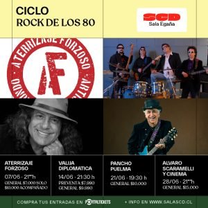 La Sala SCD Egaña se convierte en un portal al pasado con el Ciclo Rock de los 80, una serie de conciertos que hará de una fiesta cada sábado de junio desde las 21:00. Este evento reúne a cuatro íconos del rock pop chileno: Aterrizaje Forzoso, Valija Diplomática, Pancho Puelma y Álvaro Scaramelli con Cinema, para revivir la energía de una década que marcó la historia musical del país.