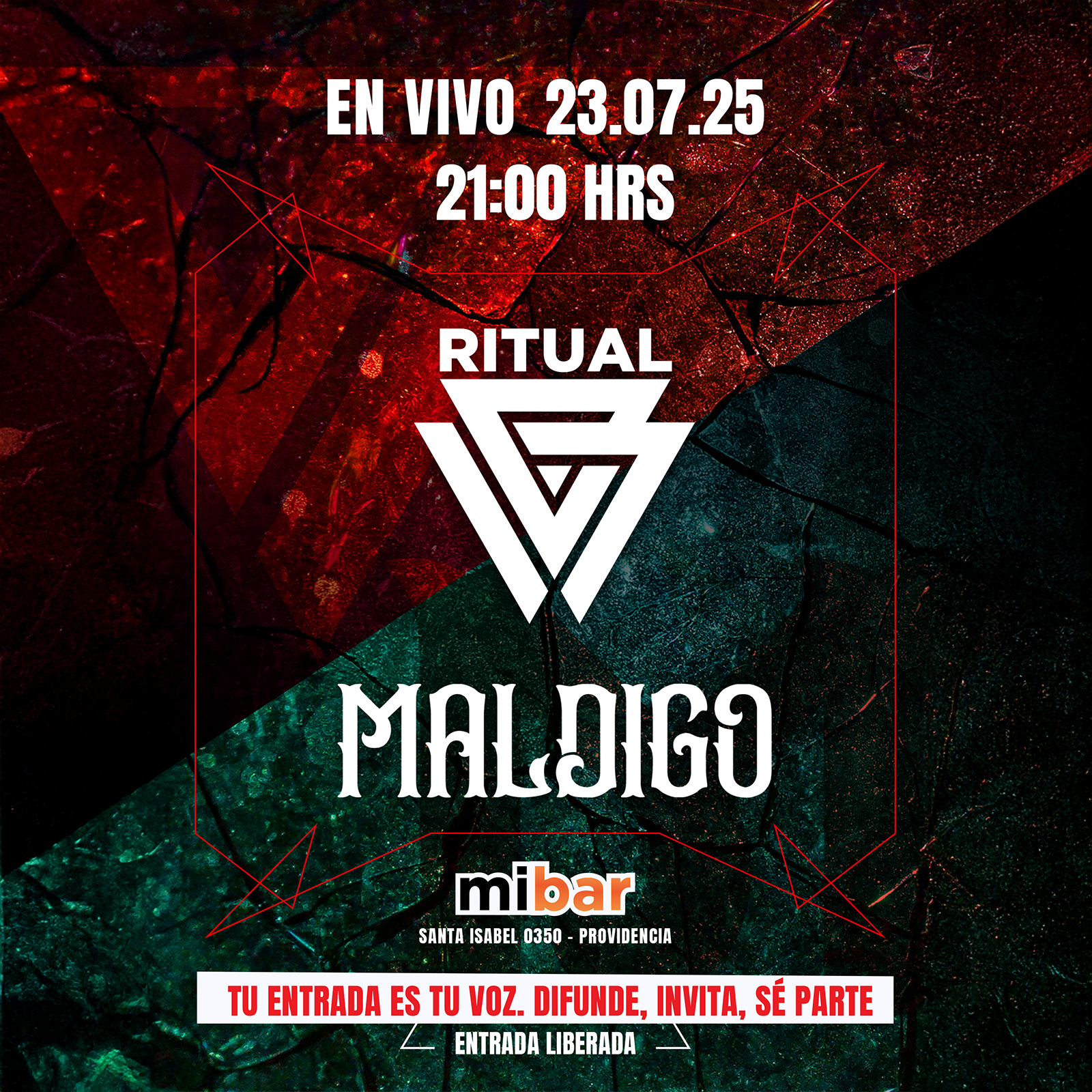 El próximo miércoles 23 de julio, a las 21:00 hrs, el escenario de MiBar (Santa Isabel 0350, Providencia) recibirá a dos potentes propuestas del circuito independiente chileno: Ritual y Maldigo, en un show con entrada liberada previa inscripción en www.ritualproducciones.cl.
