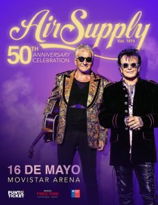El legendario dúo australiano Air Supply, formado por Graham Russell y Russell Hitchcock, conmemora medio siglo de trayectoria desde que se conocieron en 1975 durante la gira australiana de “Jesus Christ Superstar”. Reconocidos mundialmente por sus inolvidables baladas y energía romántica en el escenario, celebrarán su aniversario número 50 en Movistar Arena el próximo 16 de mayo, marcando un momento único e irrepetible.