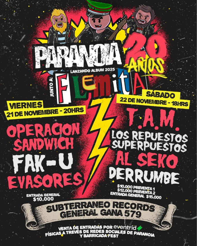 Ambas noches contarán con un invitado de lujo: Flemita, emblema del punk sudamericano que llega con toda su artillería para prender fuego a esta imperdible celebración. Además, el cartel lo completa una explosiva mezcla de nombres consagrados y emergentes de la escena punk local.
