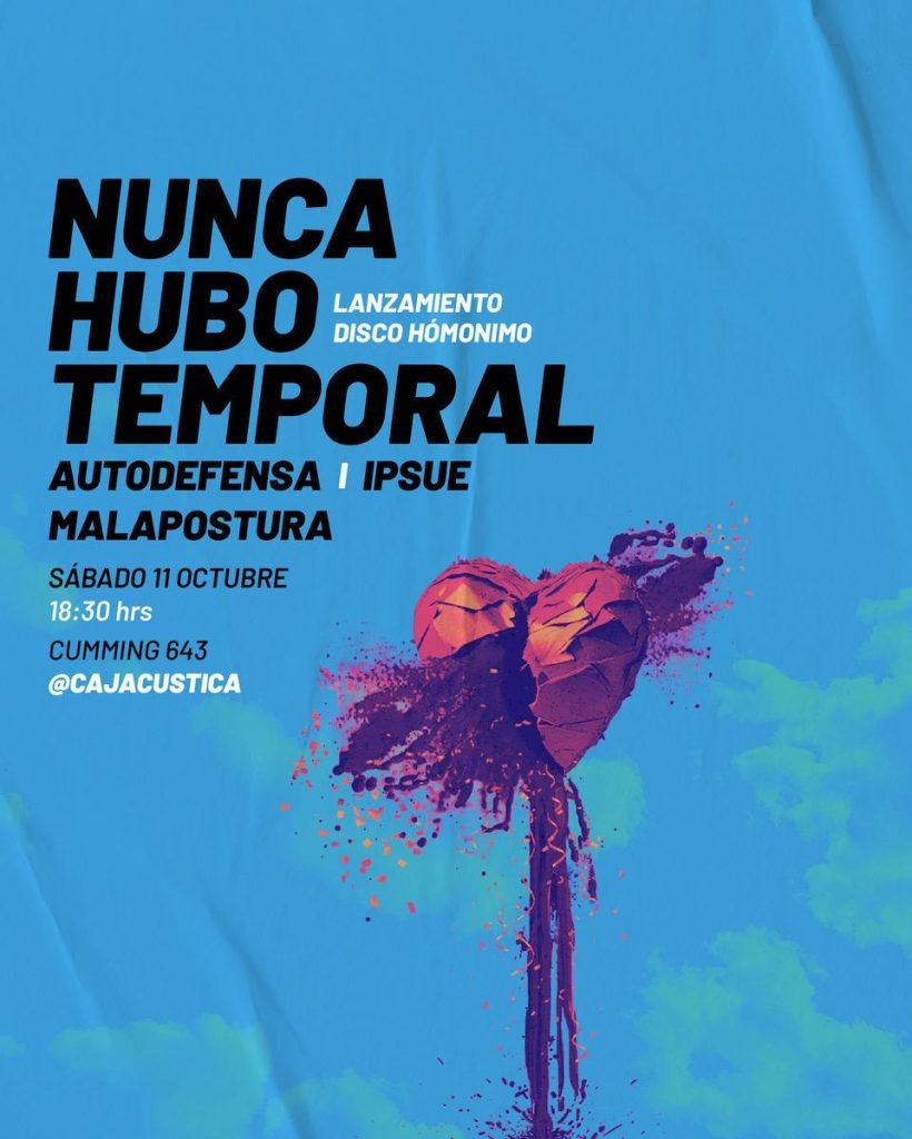 El próximo viernes 11 de octubre la banda chilena Nunca Hubo Temporal presentará oficialmente en vivo su primer disco homónimo, publicado en mayo de este año. El concierto se realizará en Caja Acústica (Cumming 643, Santiago) a partir de las 18:30 horas, y contará con la participación de tres agrupaciones invitadas: Autodefensa, IPSUE y Mala Postura.